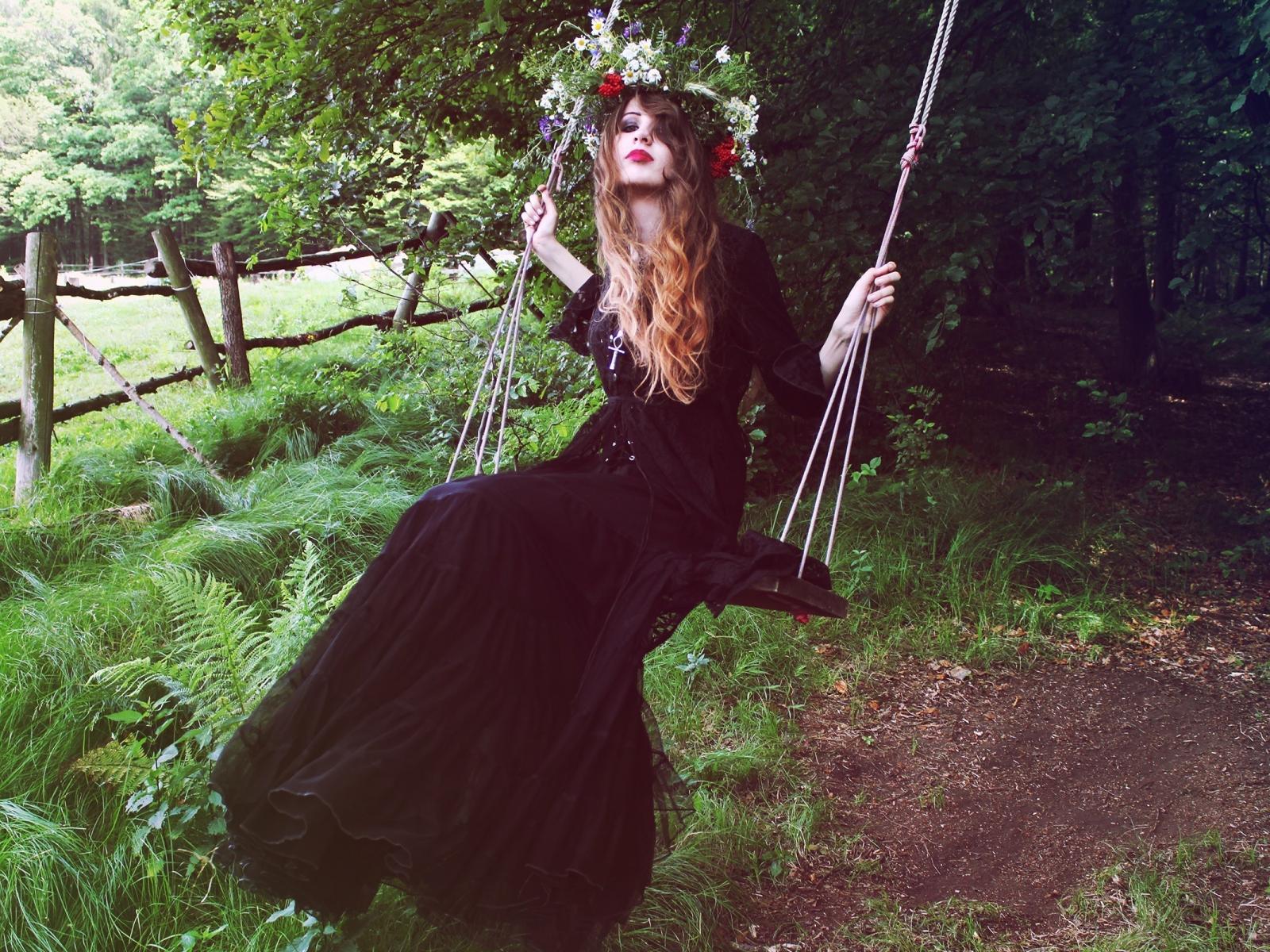 Wallpaper The girl in a black dress on swing