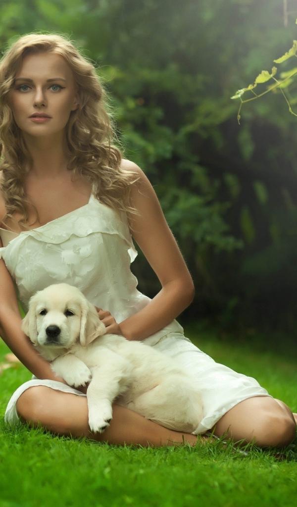 Wallpaper Girl in white dress with white puppy