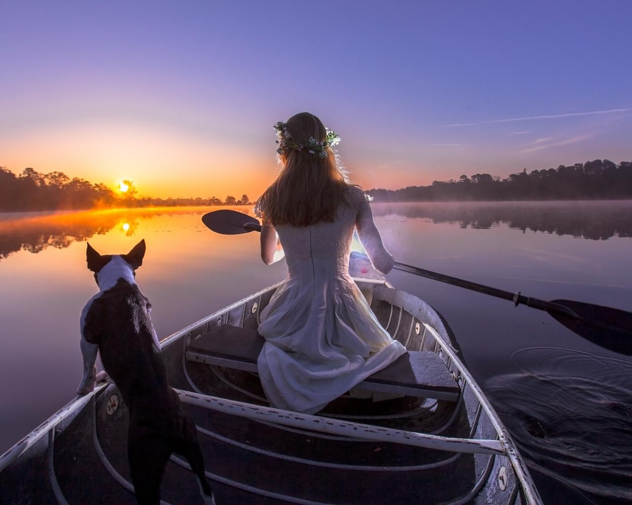 Wallpaper Girl in boat with dog