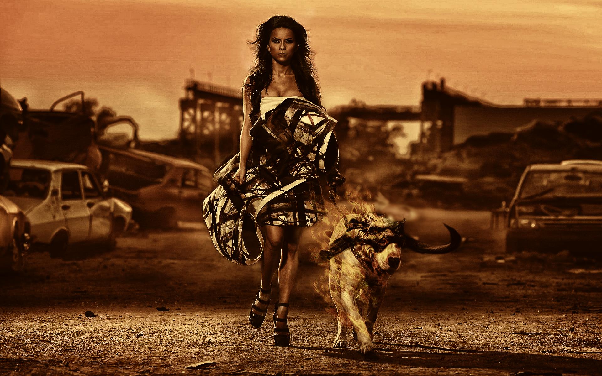 Wallpaper A woman with a dog on the background of the ruins