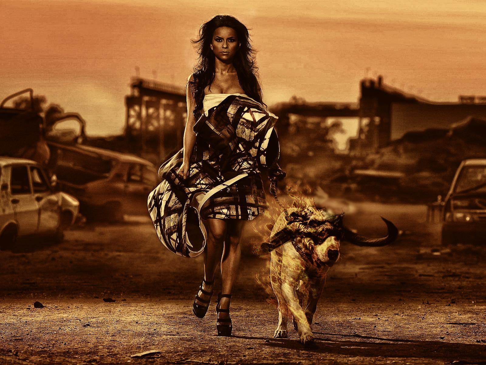 Wallpaper A woman with a dog on the background of the ruins