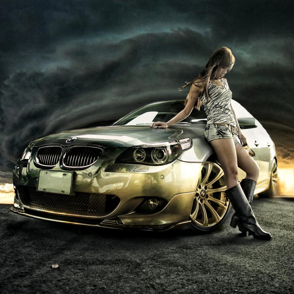 Wallpaper The girl at the gold BMW against the backdrop of a hurricane