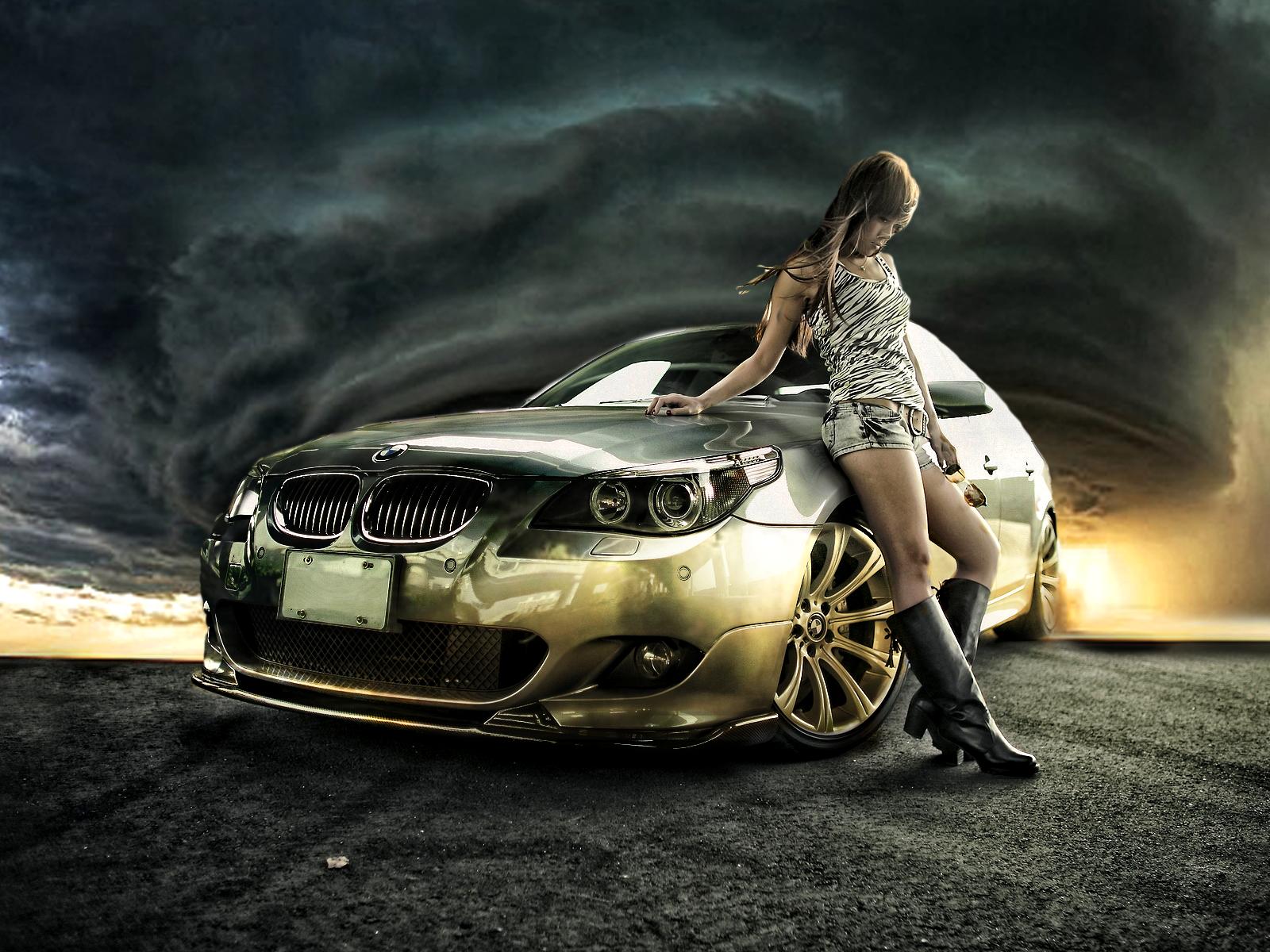 Wallpaper The girl at the gold BMW against the backdrop of a hurricane