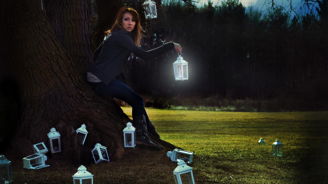 Wallpaper The girl at the tree with flashlights