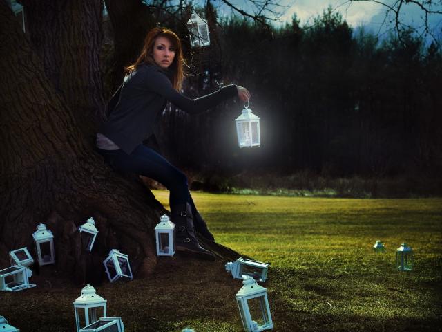 Wallpaper The girl at the tree with flashlights