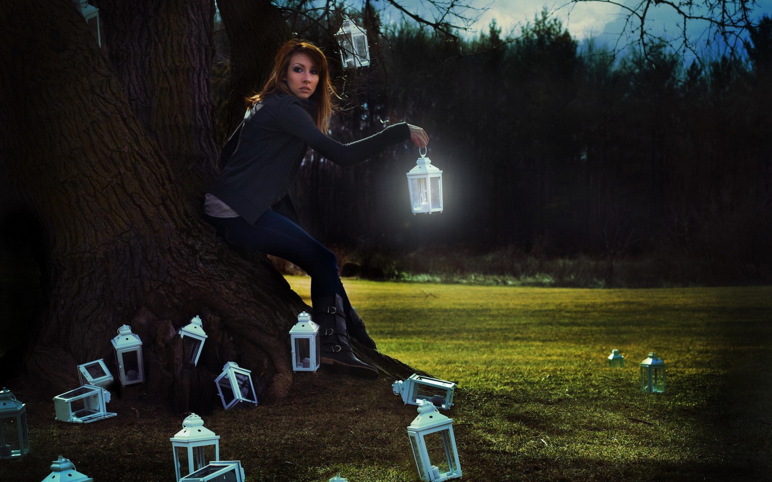 Wallpaper The girl at the tree with flashlights