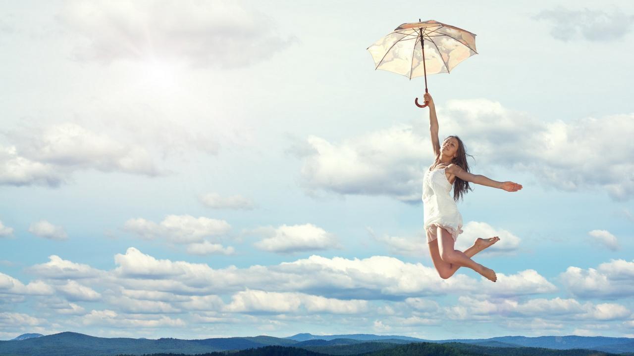 Wallpaper The girl in the sky with a bright umbrella