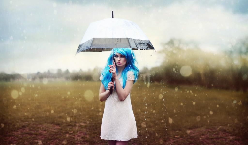 Wallpaper Blue-haired girl under white umbrella