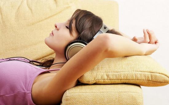 Wallpaper Girl with headphones lying on cushions