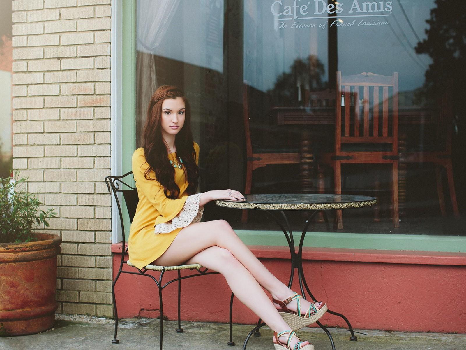 Wallpaper A girl sitting at a sidewalk cafe table