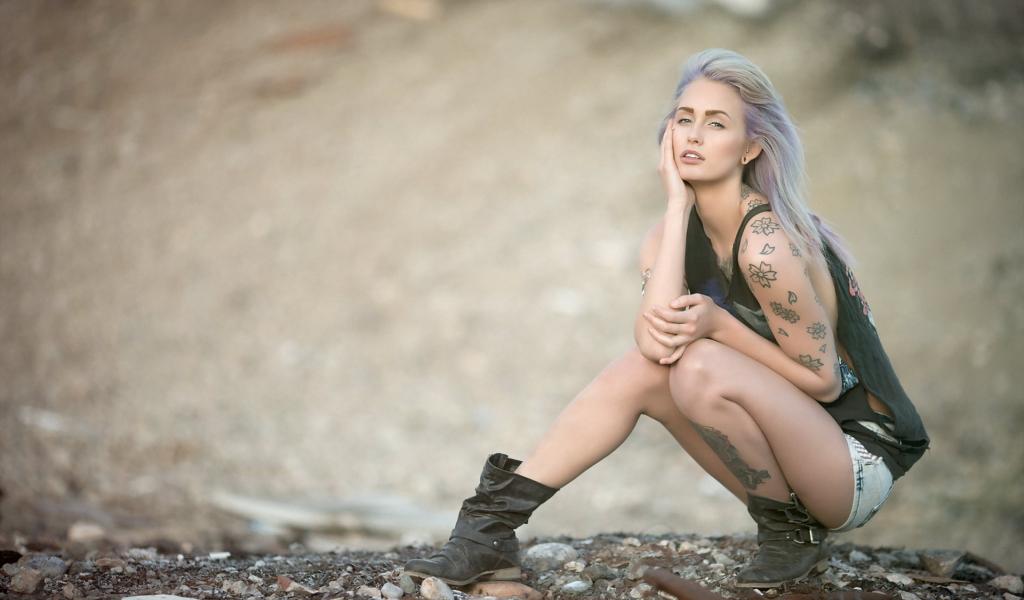 Wallpaper The girl with a tattoo in the shape of flowers sitting on his haunches