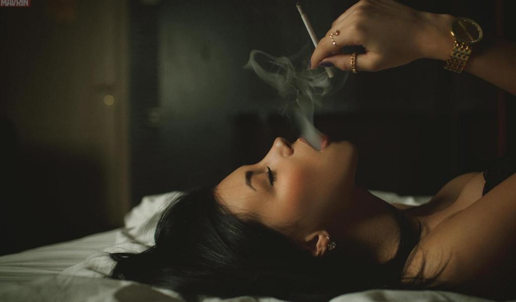 Wallpaper The girl smokes in bed
