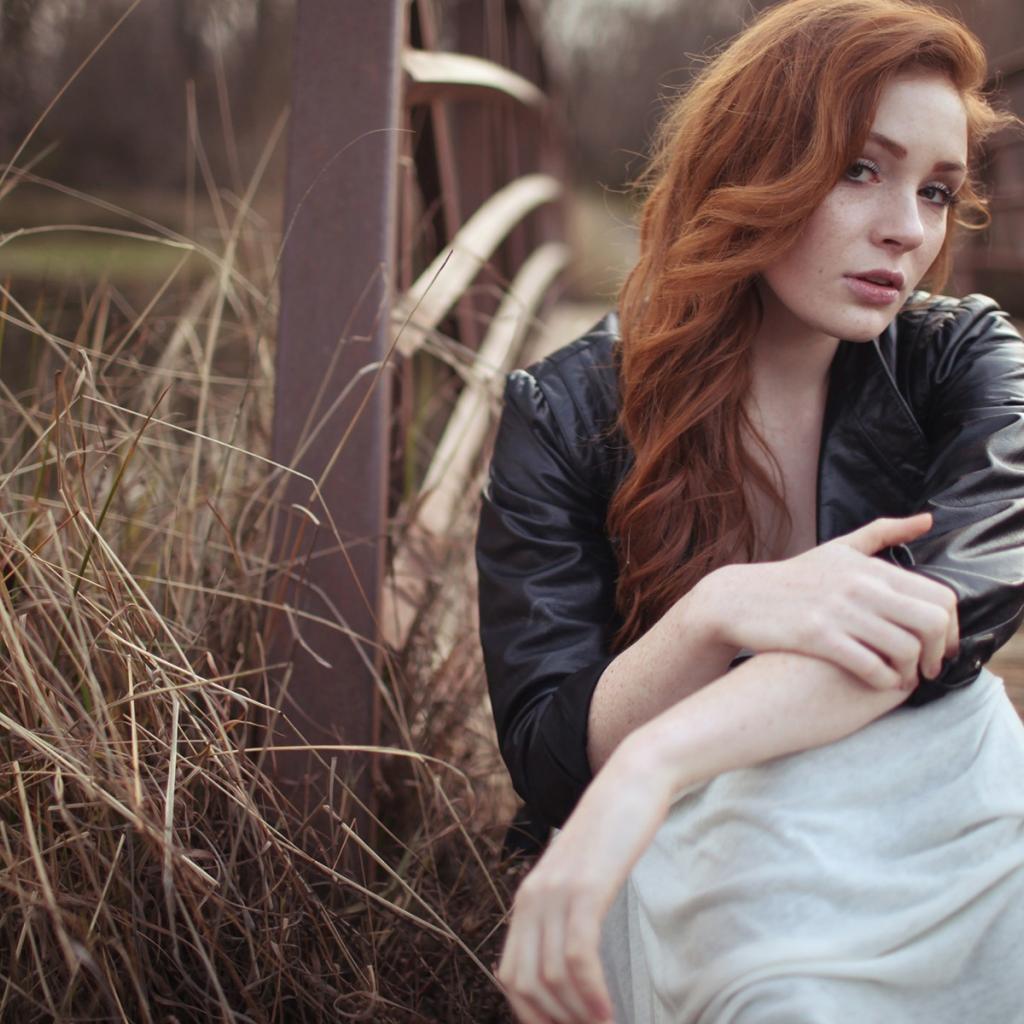 Wallpaper A girl in a leather jacket sitting at the wooden bridge