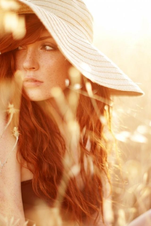 Wallpaper Red-haired girl in a hat sitting in the grass on the field