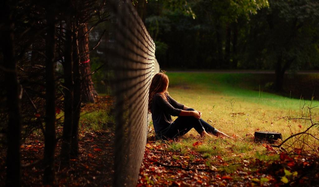 Wallpaper A girl sits in a mesh fence in the woods