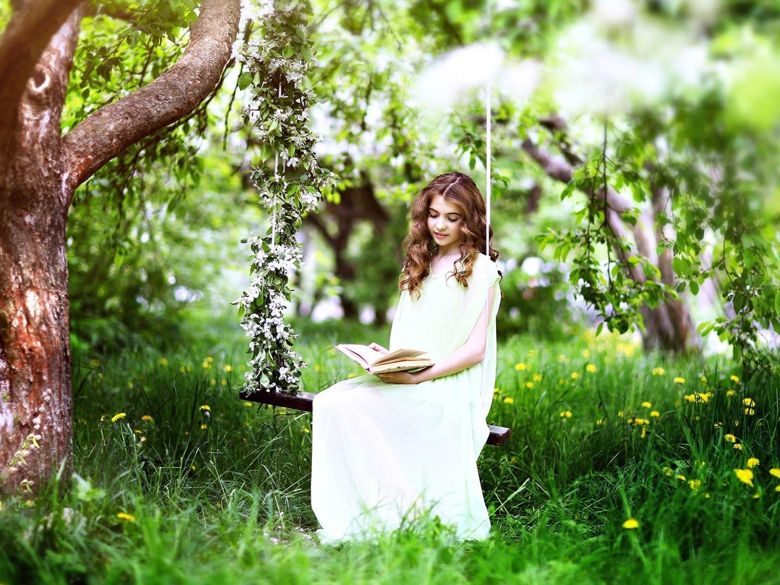 Wallpaper Girl sitting on a swing and reading a book