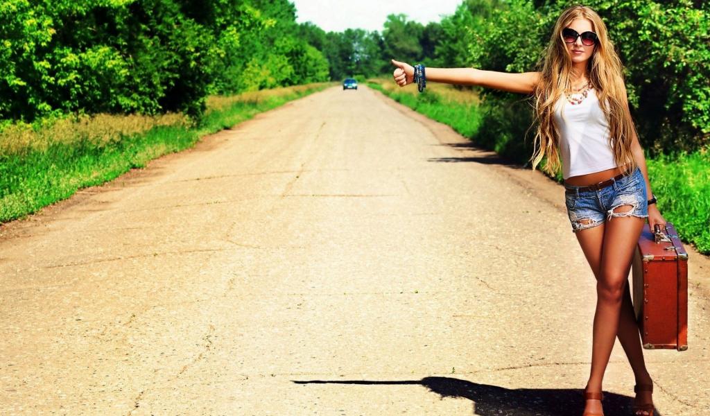 Wallpaper Girl with a suitcase has been hitchhiking