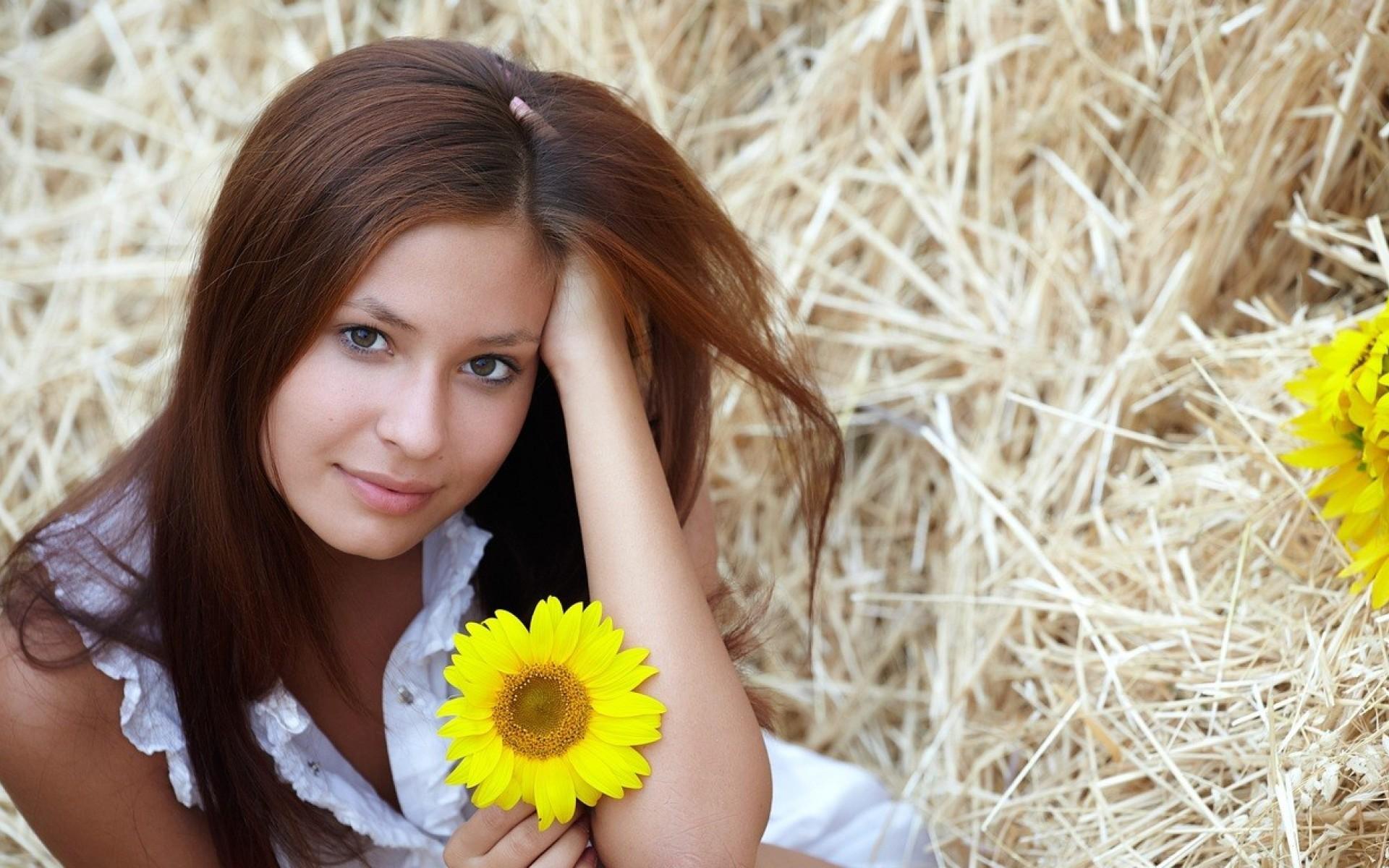 Wallpaper Girl with yellow flower sits on hay