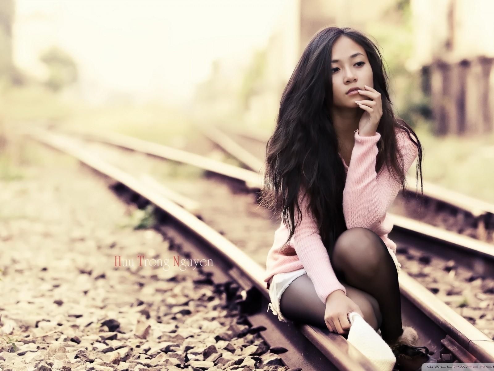 Wallpaper Brunette sitting on the cold rails
