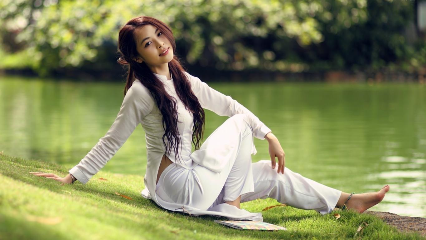 Wallpaper Japanese girl in a white suit sitting on the waterfront