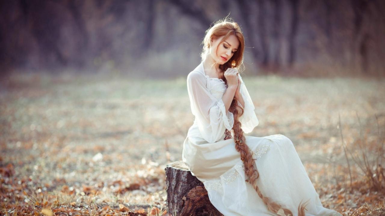 Wallpaper Girl with plait sitting on a stump