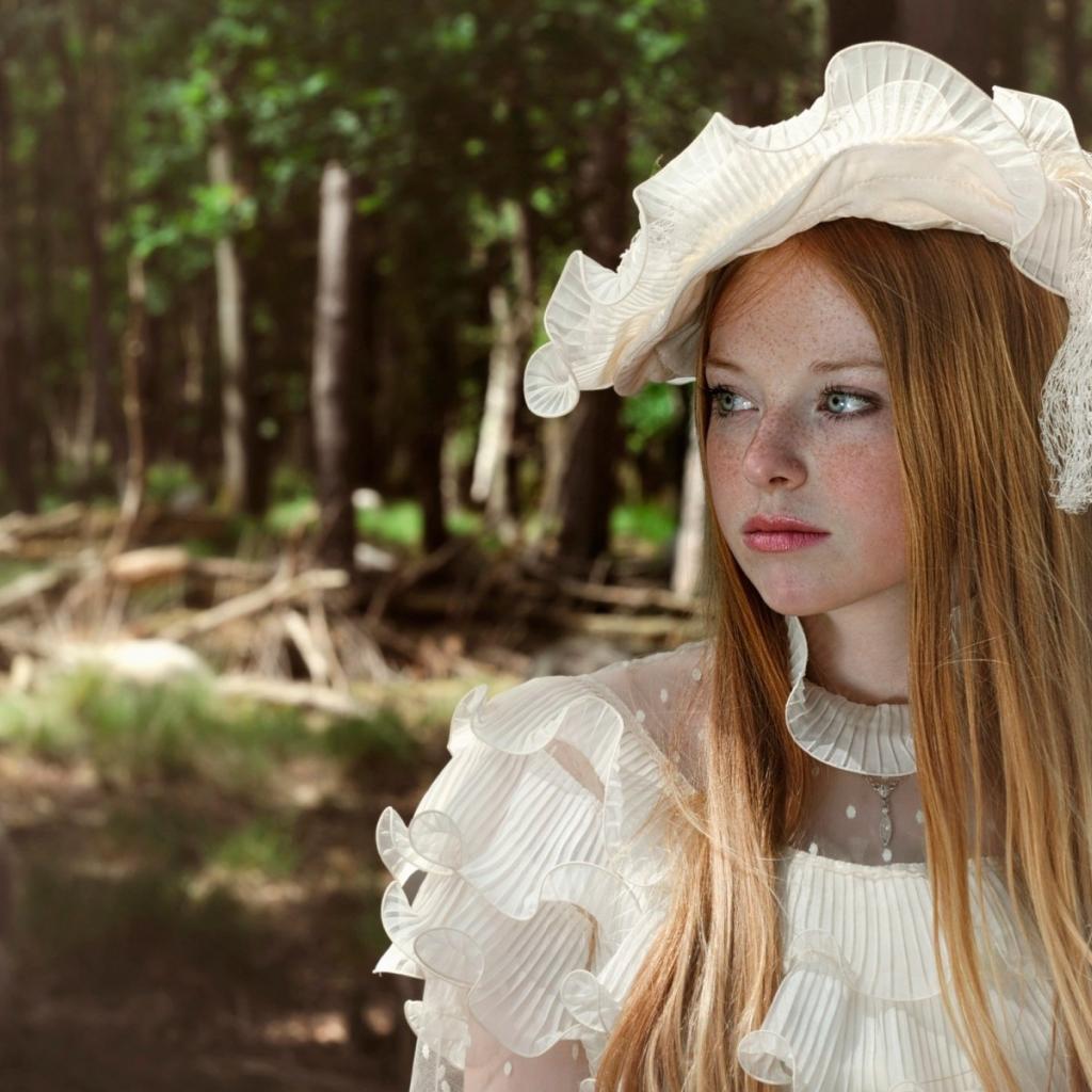Wallpaper Freckled girl in white hat standing at tree