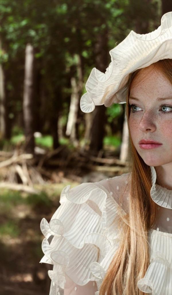 Wallpaper Freckled girl in white hat standing at tree