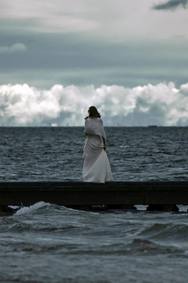 Wallpaper The girl looks at the leaden waters of the sea