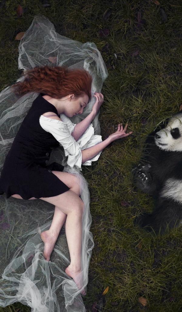 Wallpaper Panda Girl and lie side by side on the grass