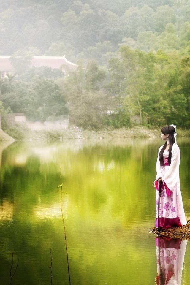Wallpaper Japanese girl is standing on the waterfront