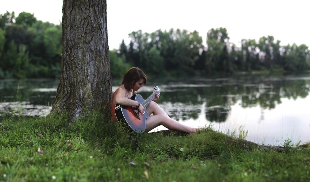 Wallpaper Girl sitting with a guitar on the riverbank