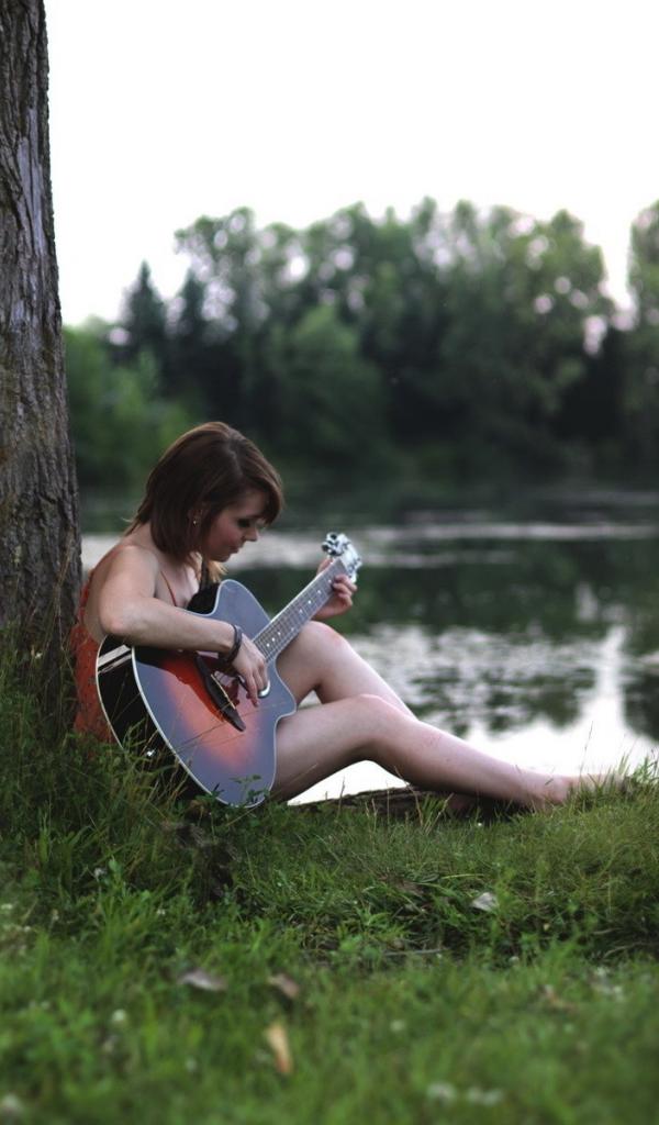 Wallpaper Girl sitting with a guitar on the riverbank