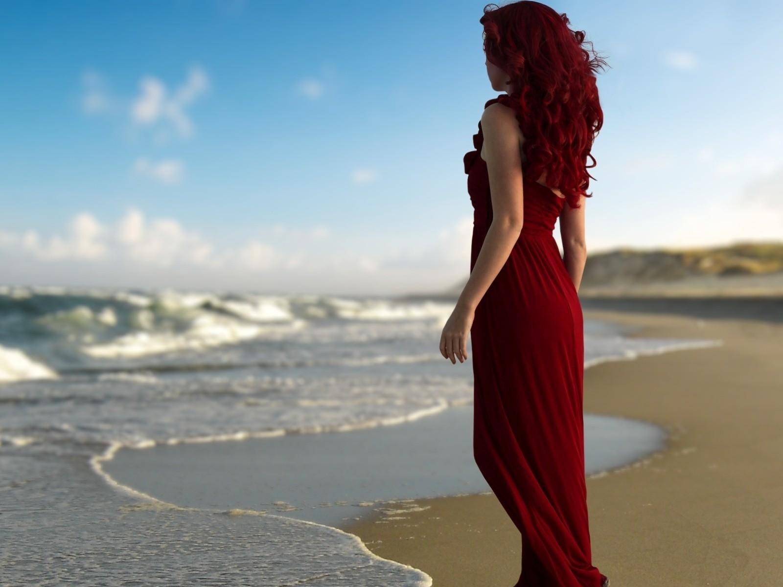 Wallpaper Girl with red hair in a red dress on the beach