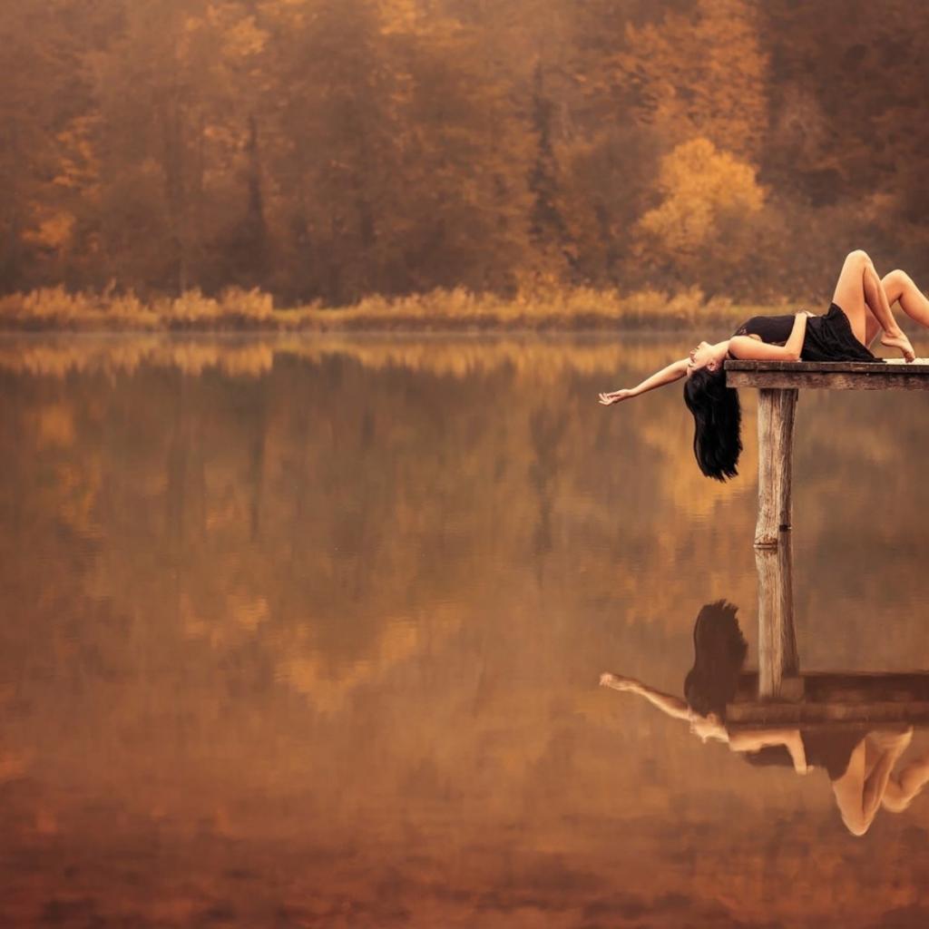 Wallpaper Brunette lying on a pier on the lake