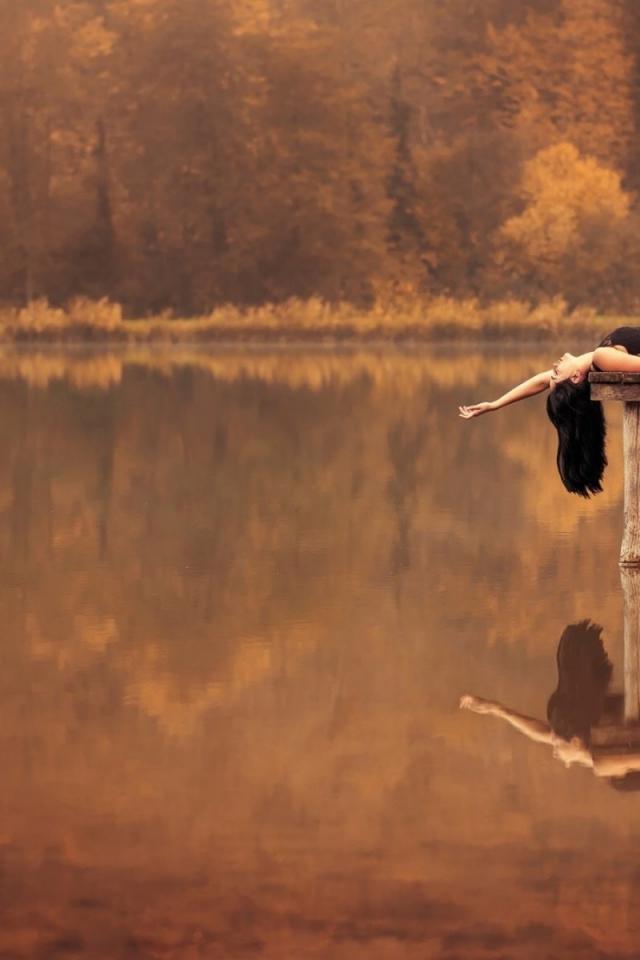 Wallpaper Brunette lying on a pier on the lake