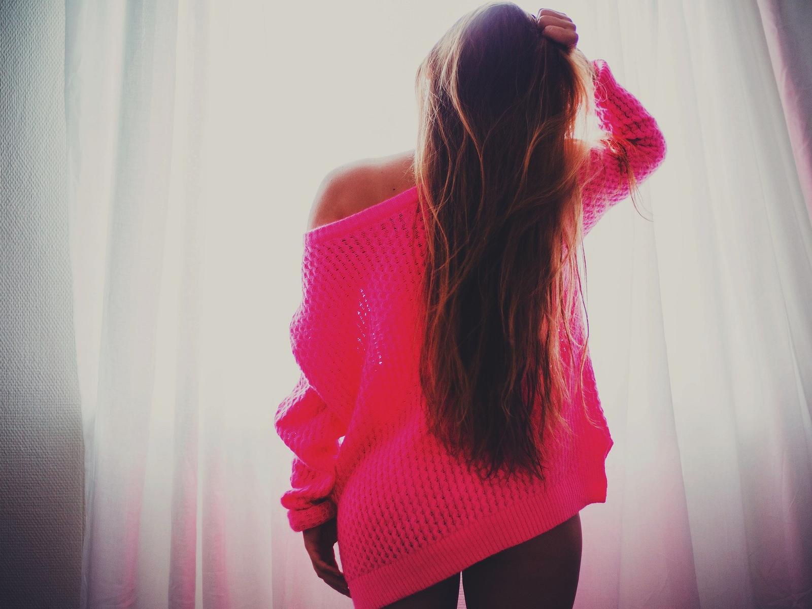 Wallpaper Brunette in a pink jacket standing at the window