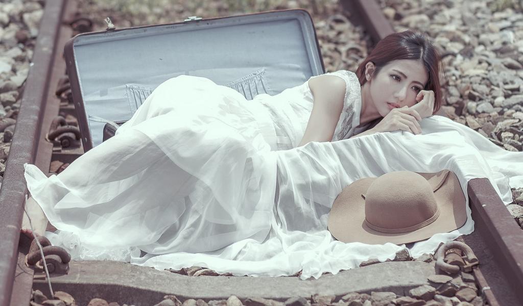 Wallpaper Girl lying in the suitcase on the rails