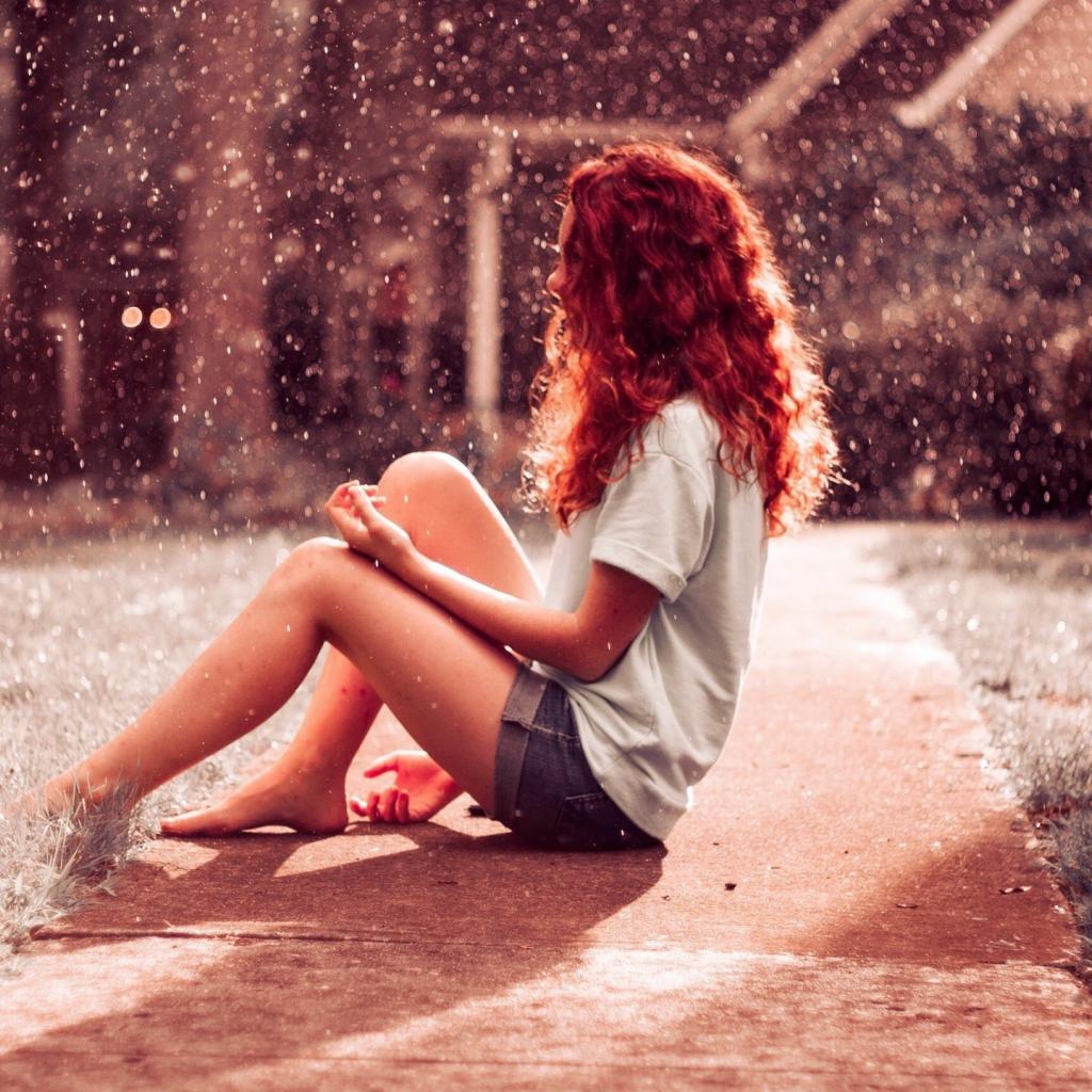 Wallpaper Red-haired girl sitting on the ground in the rain