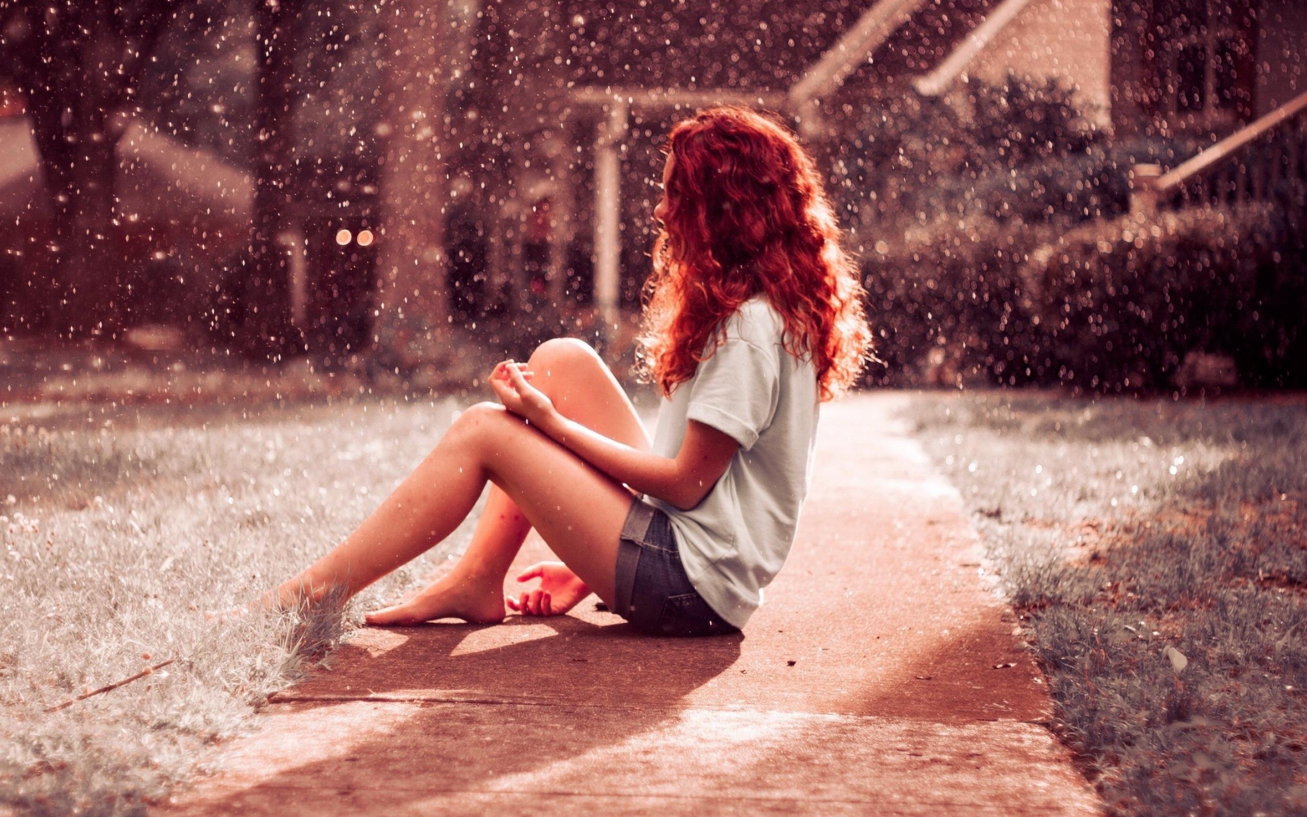 Wallpaper Red-haired girl sitting on the ground in the rain