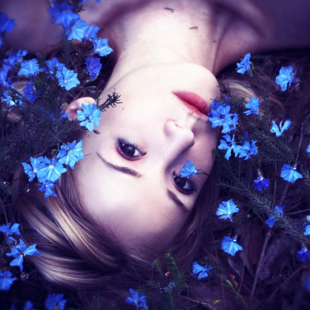 Wallpaper Girl among small blue flowers