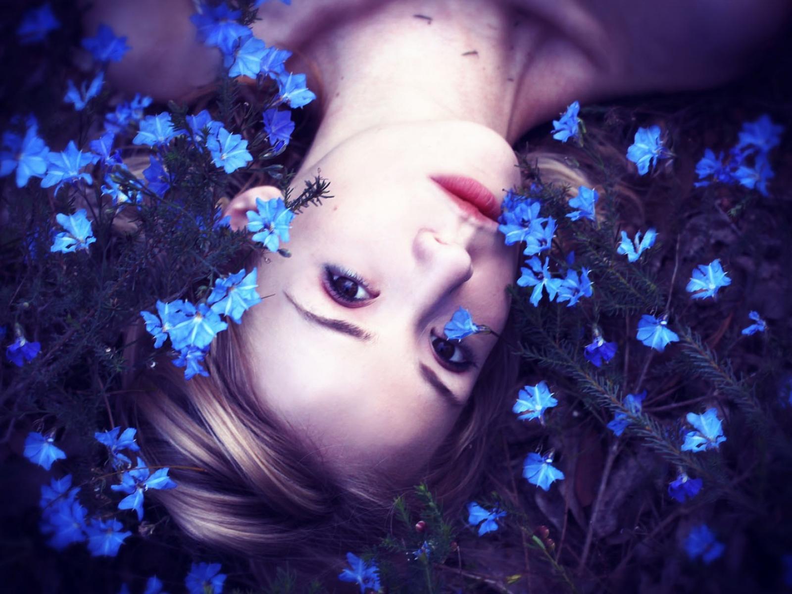 Wallpaper Girl among small blue flowers