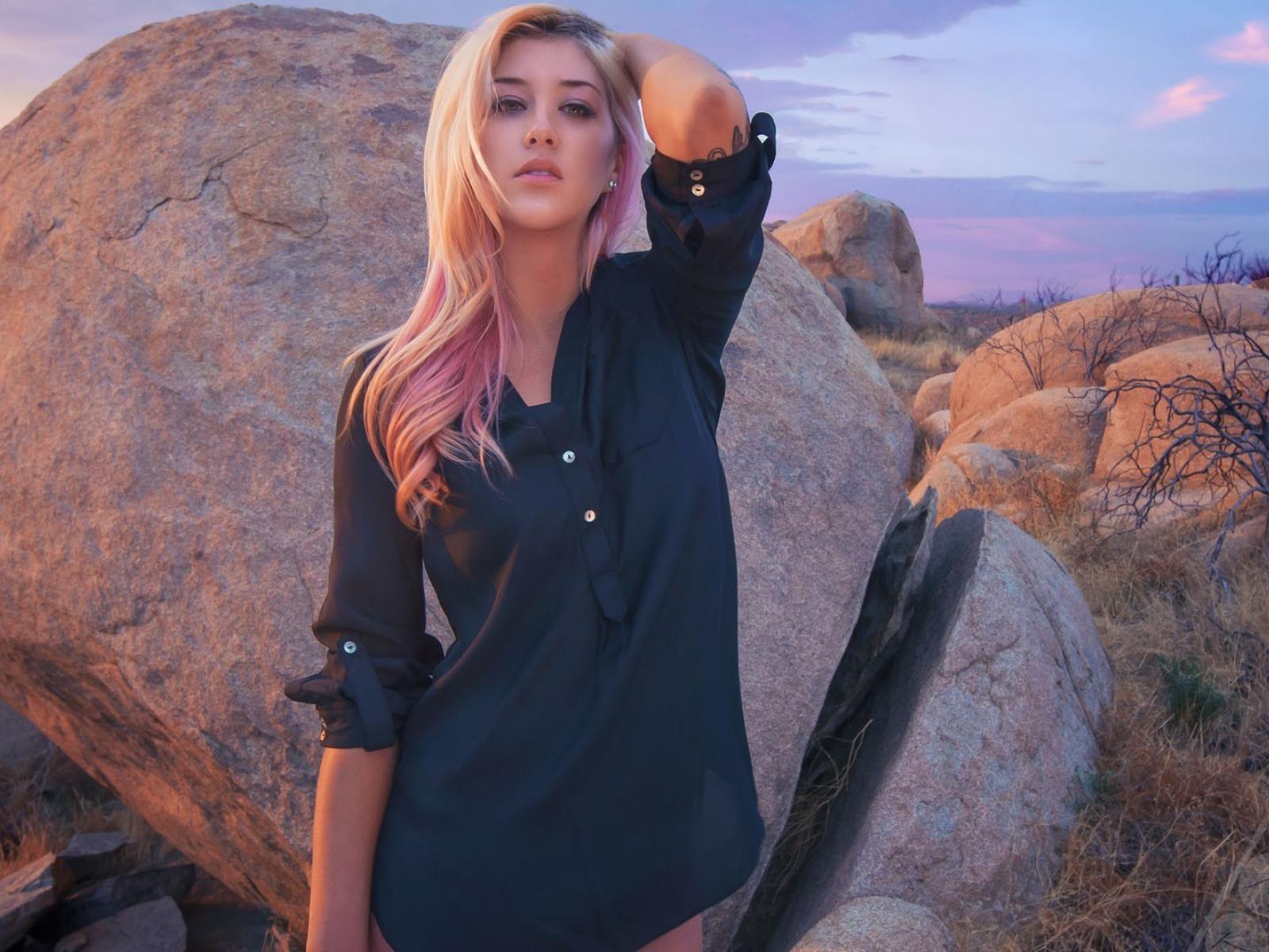 Wallpaper Blonde standing at a large boulder