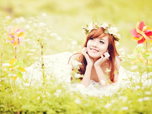 Wallpaper Red-haired Japanese girl lying in a field of flowers