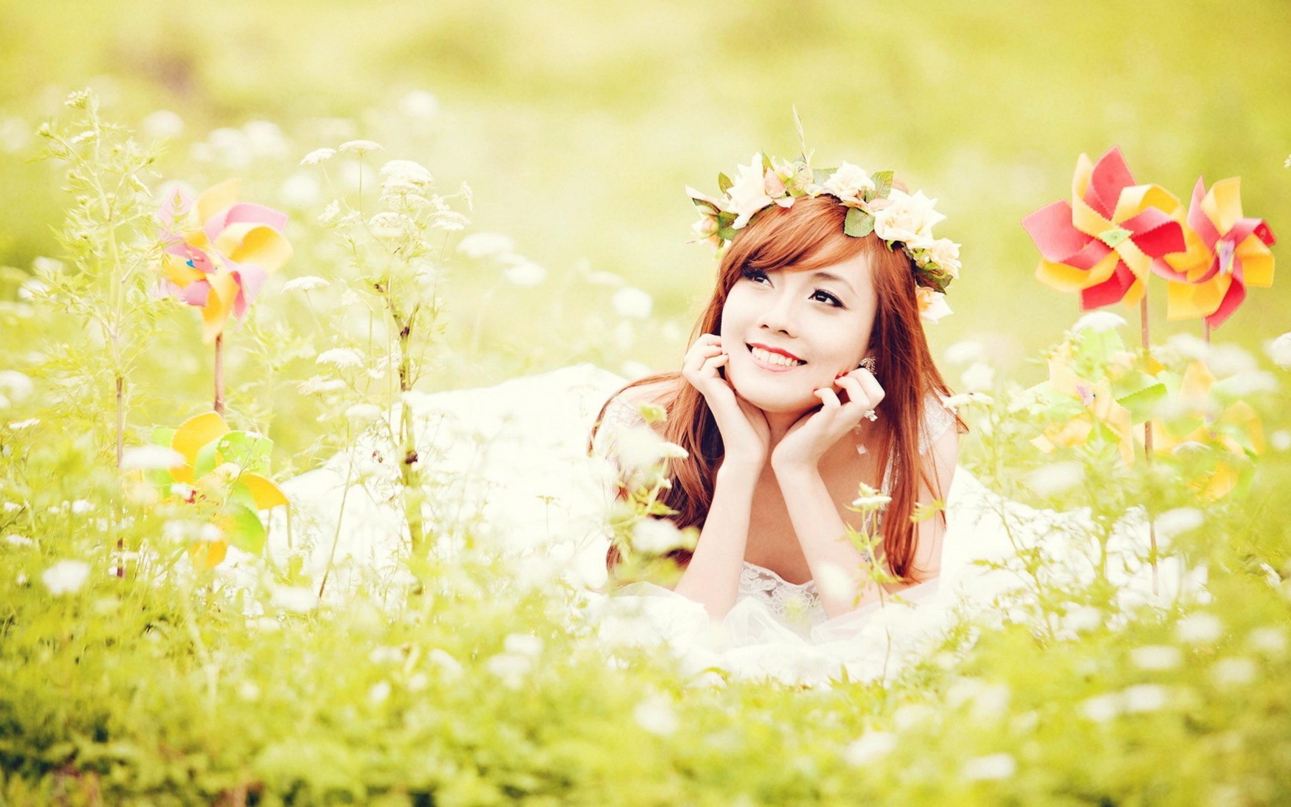 Wallpaper Red-haired Japanese girl lying in a field of flowers