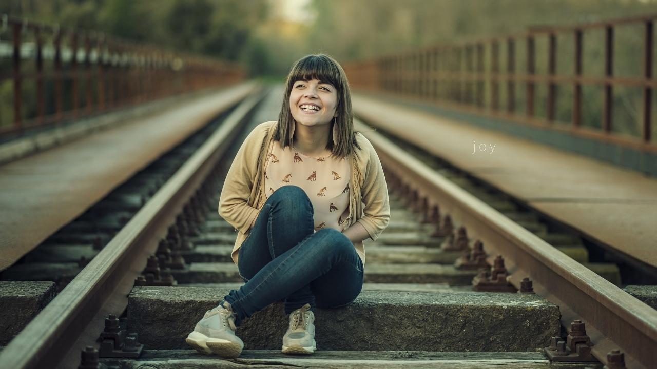 Wallpaper Girl smiling while sitting on the rails