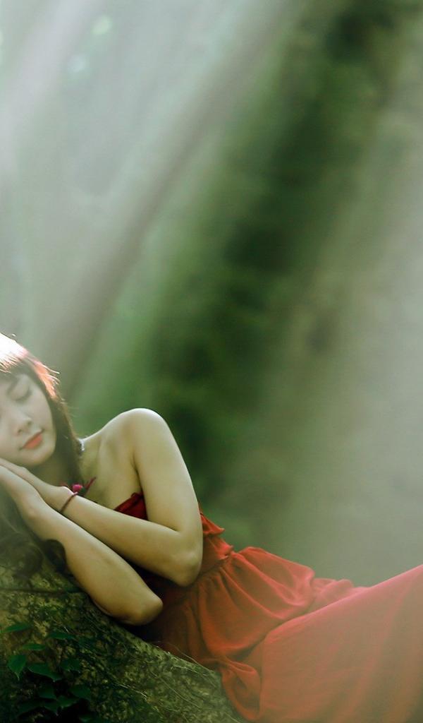 Wallpaper The girl lay down to rest on a tree trunk