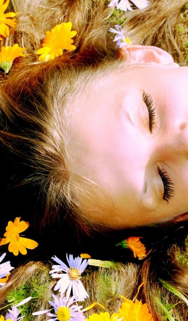 Wallpaper White and yellow flowers in the hair of the girl