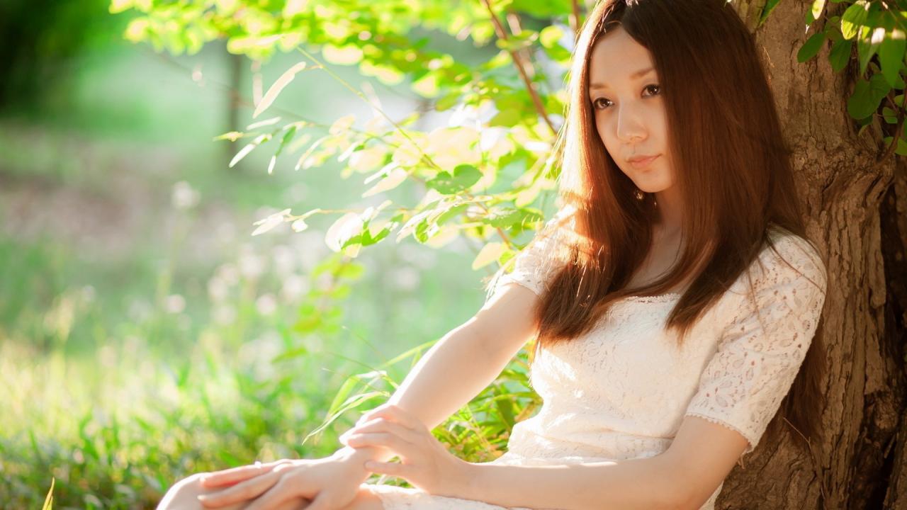 Wallpaper Asian girl leaning against a tree