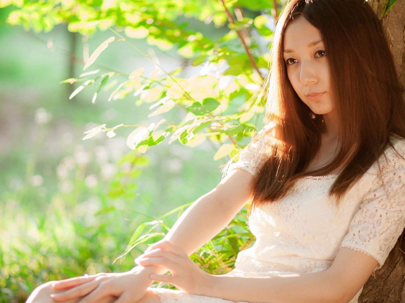 Wallpaper Asian girl leaning against a tree