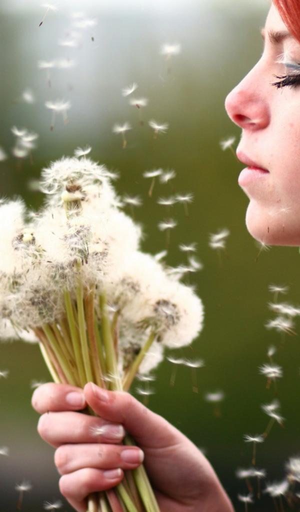 Wallpaper Girl holding a bouquet of dandelions